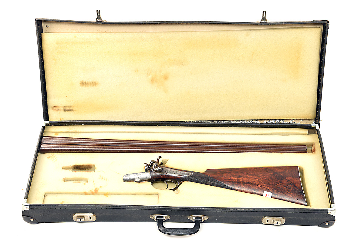 A. ELLIS 12-BORE ROTARY-UNDERLEVER HAMMERGUN, no visible serial number, circa 1870, 30in. nitro reproved bold twist barrels, the rib engraved 'A. ELLIS EXETER', 2 1/2in. chambers, true cyl. in both, Jones patent rotary underlever, carved percussion fences, non-rebounding back-action locks, border and scroll engraving, 14 3/8in. figured stock including steel buttplate, fore-end wood with repairs, weight 7lb. 2oz., in a case