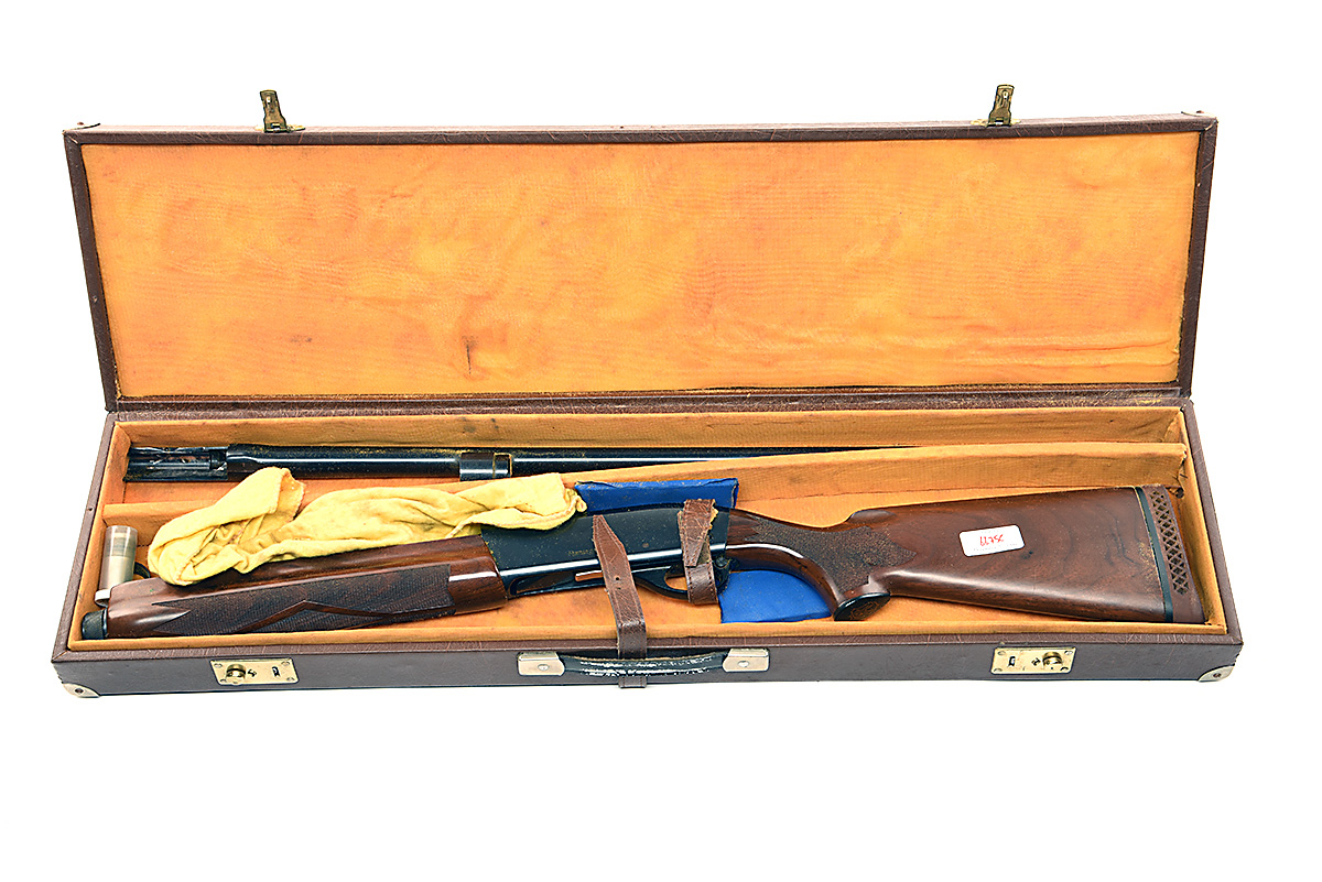 REMINGTON 12-BORE 'MODEL 11-87' SEMI-AUTO SHOTGUN, serial no. PC168098, circa 1989, restricted magazine, 30in. nitro barrel with 7mm raised ventilated matt rib, 2 3/4in. chamber, multichoke (with spares), manual push-button safety, plain blacked action, 14 1/2in. pistolgrip stock including ventilated rubber recoil pad, in a faux leather case with decomposing lining