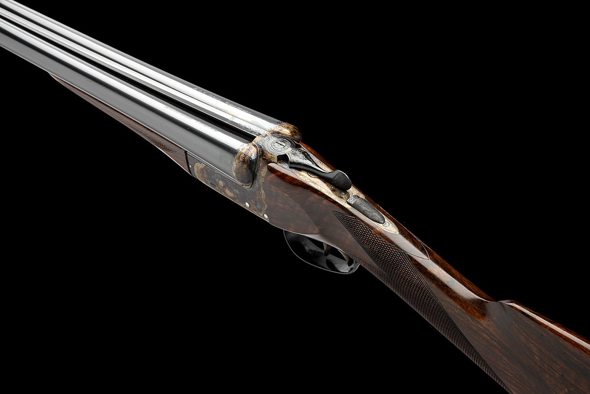 dated 1980, 26in. nitro barrels, tubes engraved 'W. & C. SCOTT. GUNMAKERS. BIRMINGHAM. ENGLAND.', 2 3/4in. chambers, bored approx. 1/2 and full choke, scroll-backed action, automatic safety with gold-inlaid 'SAFE' detail, border and partial scroll engraving, the underside engraved 'THE BOWOOD', retaining virtually full original colour-hardening and finish, 14 3/4in. figured stock, weight 6lb. 4oz.