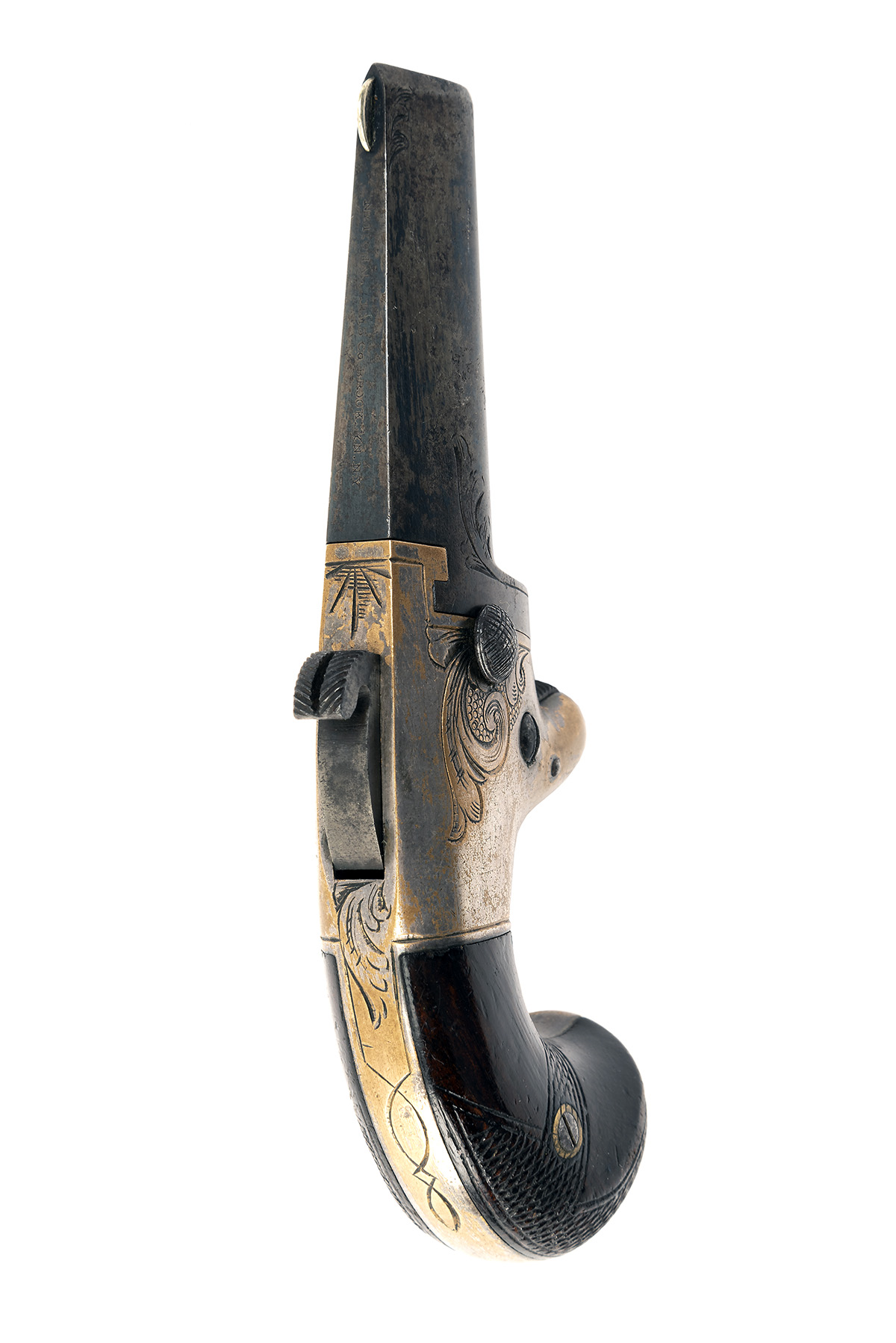 circa 1880, with tapering reblued iron 2 1/8in. barrel hinging sideways to load, the flat sighting plane signed 'NATIONAL ARMS CO, BROOKLYN, N.Y.', brass scroll engraved frame with central hammer and spur trigger and retaining traces of silver plating and fitted with chequered walnut birdshead grips