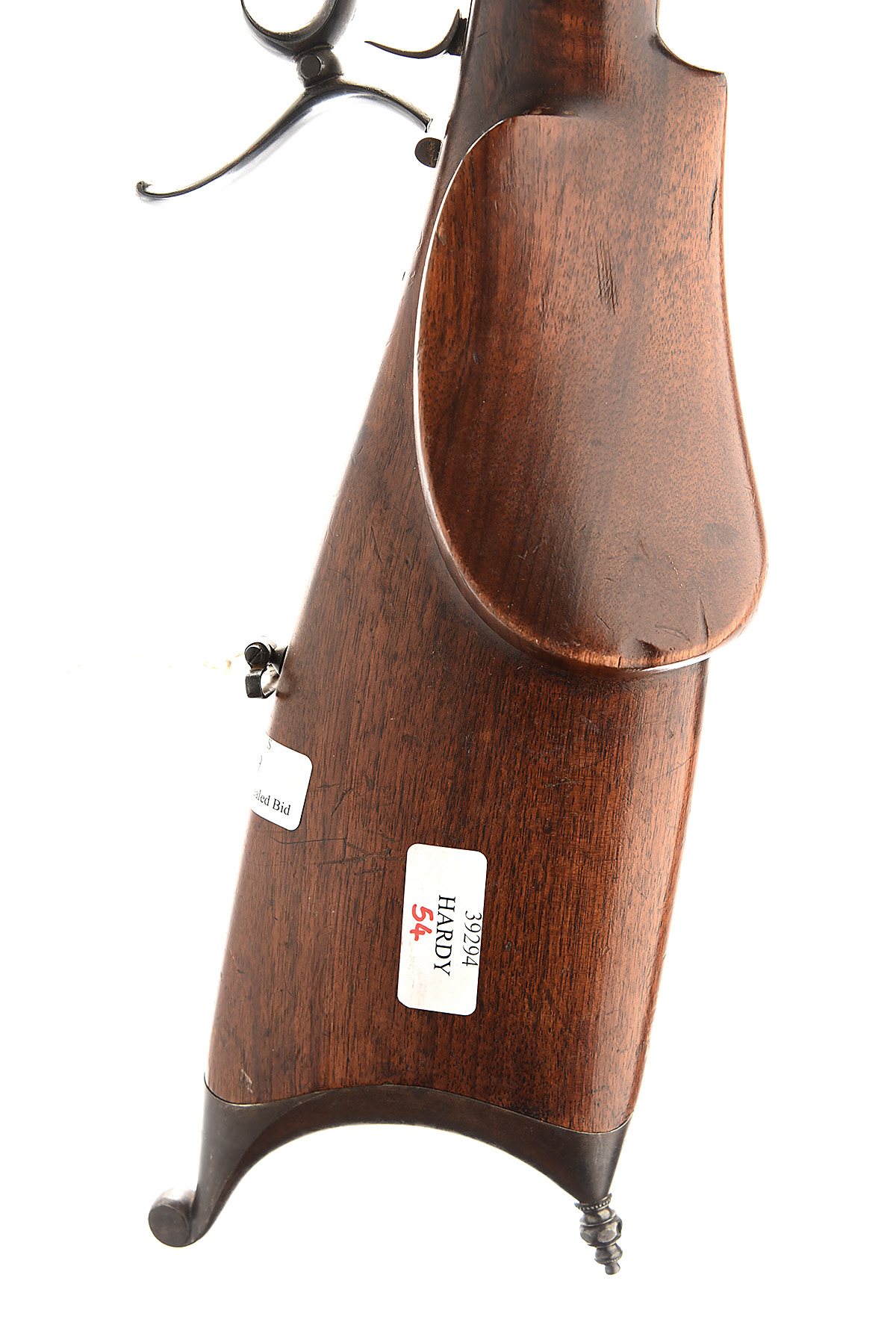 A GOOD 4MM (ZIMMER) RIMFIRE TARGET RIFLE SIGNED C. STIRGELE INN MUNCHEN, no visible serial number, circa 1920, German made with 29in. heavy octagonal barrel, the front 7 3/4in. housing the Zimmer mechanism, the mechanism loaded via an external lever mounted back from the muzzle that opens the breech, dovetailed vee form front-sight, micro adjustable pan-headed peep-sight mounted to action tang, double set triggers, two piece figured walnut stock, with chequered forend, elaborately shaped butt with cheek rest and Swiss style schutzen butt-plate, decorative chequered panel to right side of butt, the rifle with much original finish.