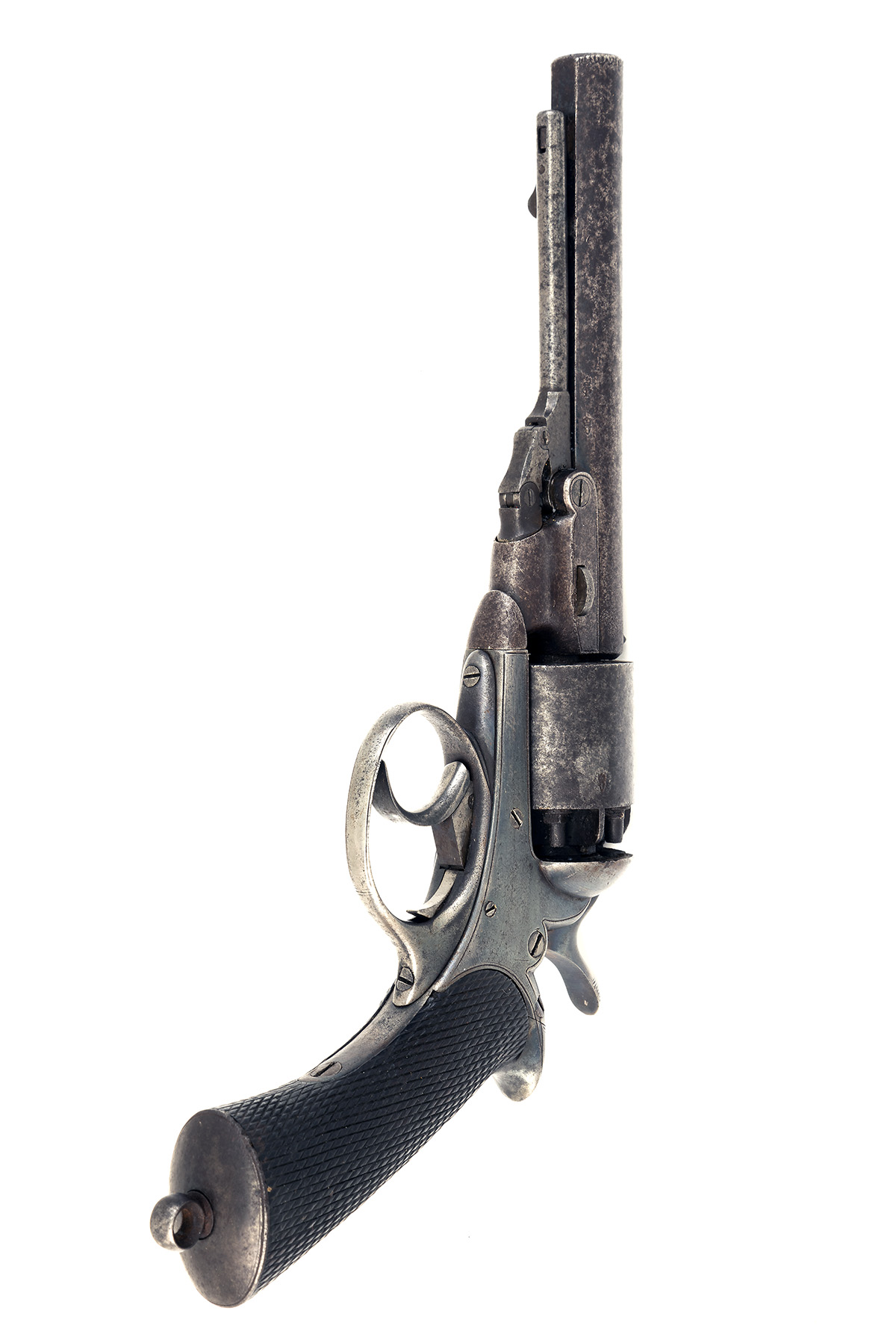 Provenance: The Daw revolver is one of the rarer of the successful British percussion revolver designs/ The patentees were Charles Pryse and Paul Cashmore, manufacture being carried out by the Birmingham firm of Pryse & Redman. George Daw bought the sole rights around 1858 and the revolver became known as the Daw revolver. It was a practical and reliable weapon and well thought of by experts of the day. The famous Times correspondent W. H. Russell wrote in glowing terms about its merits and is believed to have owned one, as did the great Italian patriot Garibaldi, presented to him by Daw in 1864.