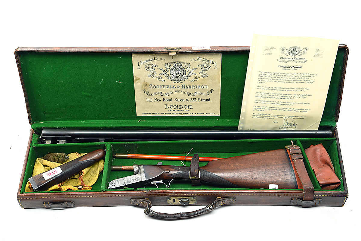 COGSWELL & HARRISON 12-BORE BOXLOCK EJECTOR, serial no. 57013, for 1933, 30in. nitro reproved barrels (left extractor damaged, barrels poor), 2 1/2in. chambers, bored approx. imp. cyl. and 3/4 choke, stepped action, automatic safety, border and acanthus scroll engraving, 14 1/4in. stock including 3/4in. rubber recoil pad, weight 6lb. 12oz., in its makers leather case