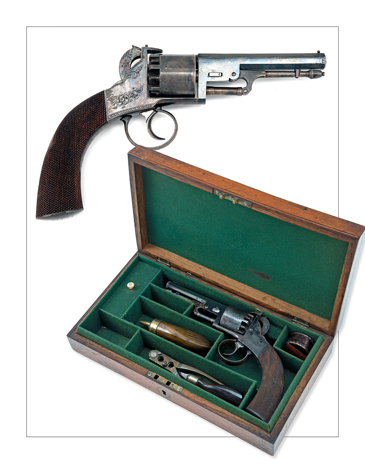 with 4 1/4in. octagonal Birmingham proofed barrel rifled with seven grooves, bead front-sight, the muzzle decorated with an engraved band and foliate scroll work at the breech, under barrel rammer of elegant form and design and held in place by a spring clip on the underside of the barrel near the muzzle, open top frame with fixed vee notch rearsight located on a standing platform projecting from the fixed breech, the left-hand side of the frame is fitted with a detachable plate to facilitate inspection and access to the lock mechanism, above this is fitted a spring safety that the hammer nose rests on when pushed in, the revolver has a cased hardened six shot cylinder (six shot cylinders are rare on English percussion revolvers), the chequered figured and flared long curving grips are fitted with an iron butt-cap with hinged trap for spare percussion caps, the frame butt-cap, trigger-guard and even the trigger are decorated with foliate scroll work, the revolver has virtually all its original finish, blue to barrel and frame and case colours to cylinder and butt-trap, the revolver is contained in its original green baize lined oak case with key, accessories include flask, mould, turnscrew and laquered cap tin, this is an exceptional piece, Webley Bentley revolvers are rarely found in this condition