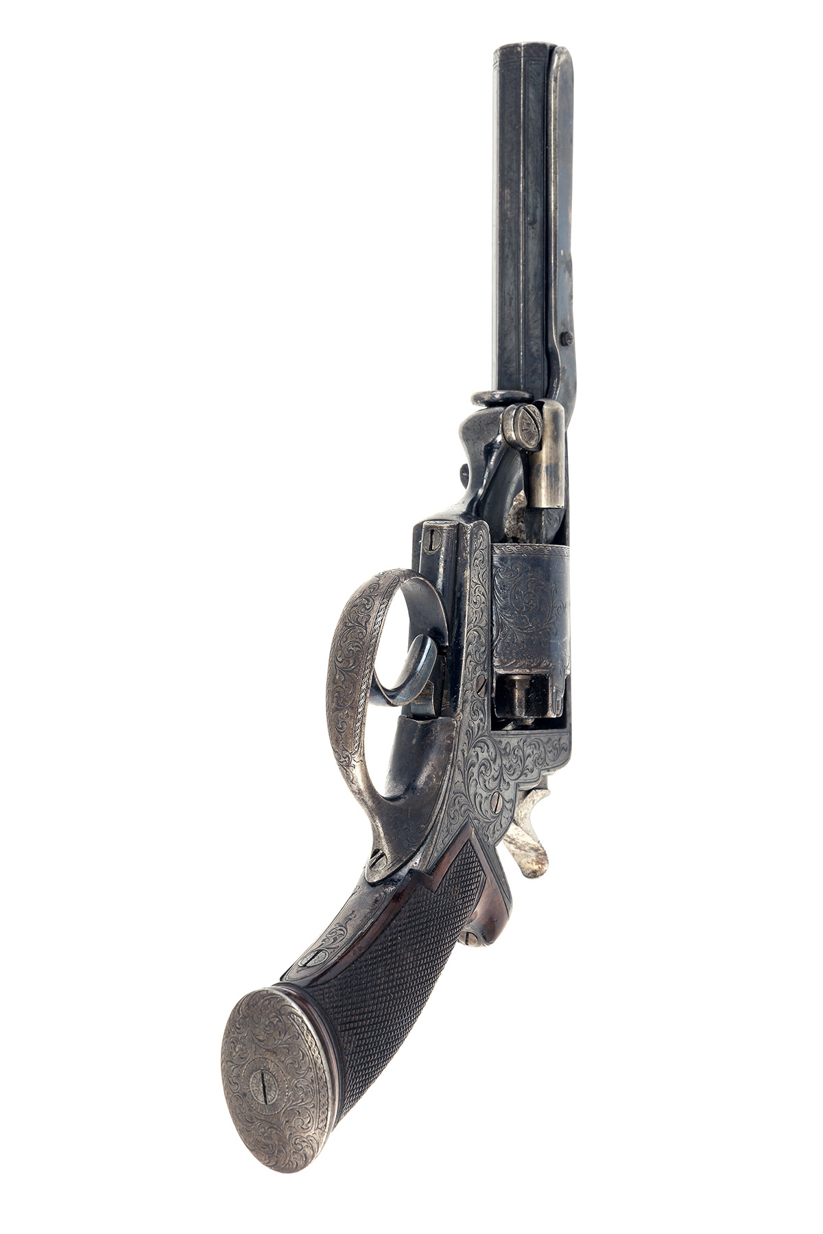 Provenance: The address of 76 King William St. was used by Robert Adams from 1859 when he left the London Armoury Co. and set up on his own. These extra engraved revolvers are exceptionally scarce, the vendors states this revolver was once in the famed Harrod collection.