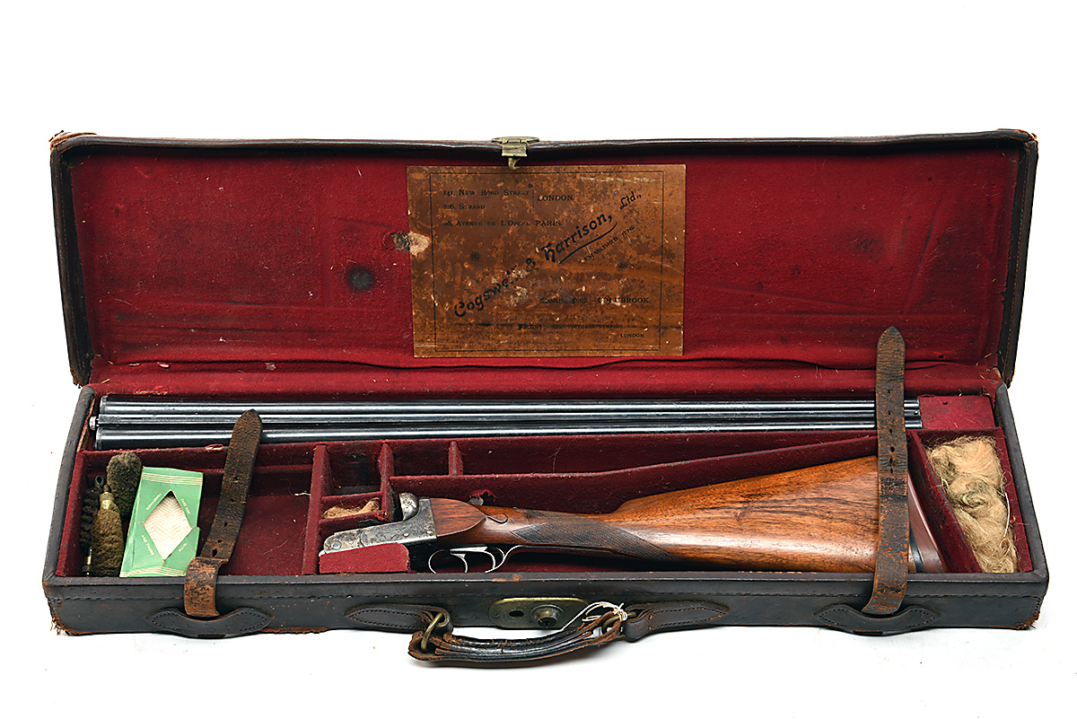 COGSWELL & HARRISON LTD. 12-BORE BOXLOCK EJECTOR, serial no. 70613, circa 1960, 28in. nitro barrels, rib engraved 'COGSWELL & HARRISON LTD. 168, PICCADILLY, LONDON. W.1./', 2 3/4in. chambers, bored approx. imp. cyl. and 1/4 choke , some rusting, bolstered action, automatic safety with gold-inlaid 'SAFE' detail, acanthus scroll engraving surrounding scenes of pointer and setter, the underside with a lone gun shooting duck, retaining some original colour-hardening, 15 1/4in. stock (cast on for the left shoulder) including 7/8in. recoil pad, weight 7lb. 1oz., in a leather case