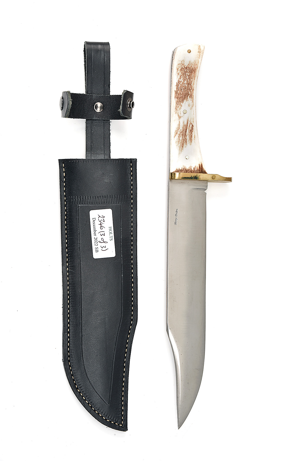 THREE LARGE BOWIE KNIVES, the first with 10 1/2 in blade stamped 'J. NOWELL at top, fitted with brass crossguard and two piece wooden grips, the second with 9 1/2 in blade heavy brass crossguard and two piece wooden grips, the third with 9 in blade stamped 'HARRY BOWDEN' brass crossguard and two piece staghorn grips, all contained in leather sheaths