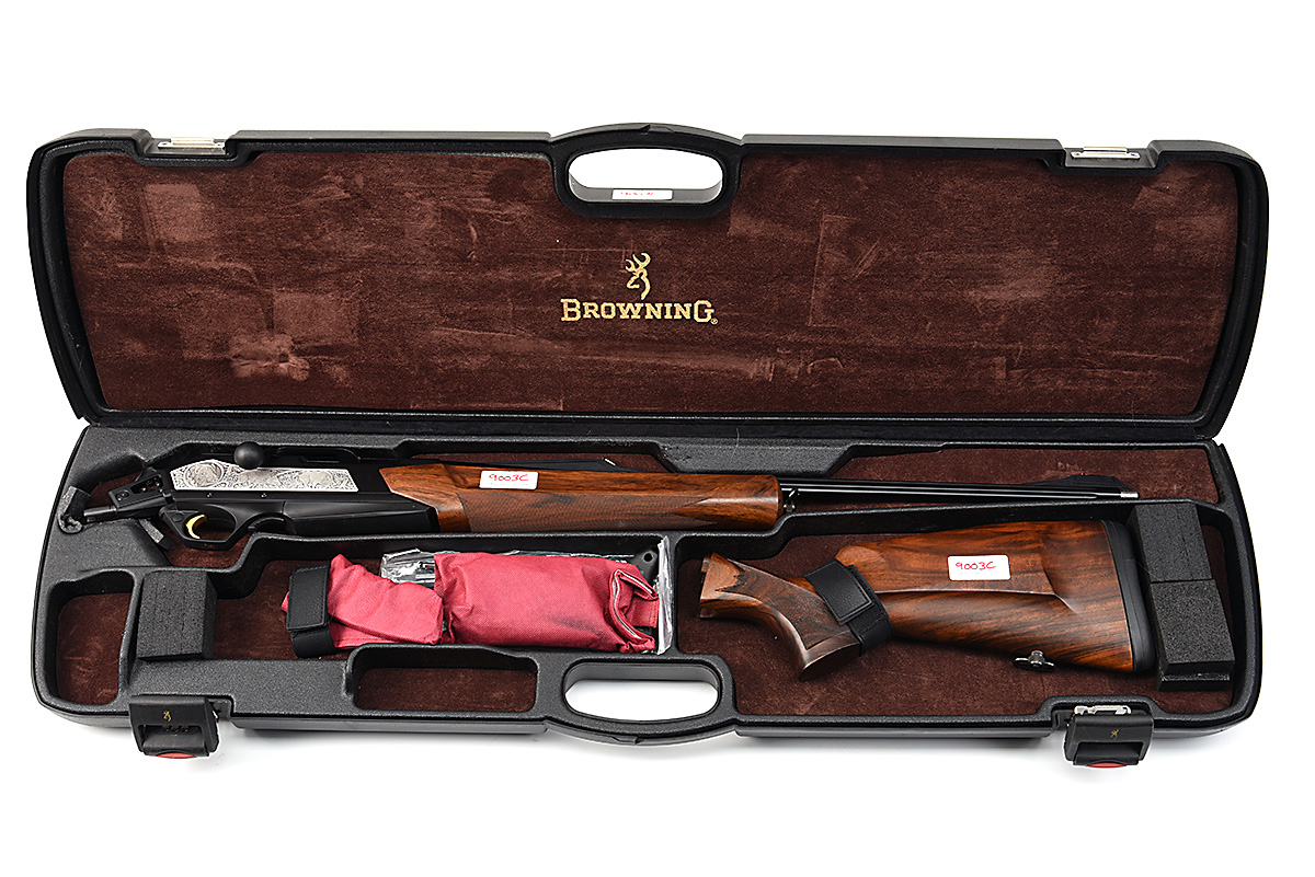 A VIRTUALLY NEW AND UNUSED BROWNING .300 WIN MAG. 'MARAL' STRAIGHT-PULL REPEATING TAKE-DOWN SPORTING RIFLE, serial no. 356ZW02896, for 2014, 23 1/2in. fluted nitro barrel threaded for sound moderator, ramp-mounted sprung bead fore-sight, high visibility rear-sight, manual safety, detachable box magazine, gold-washed trigger, blacked action with silver side panels engraved in relief with stags and boar, 14 1/4in. pistolgrip stock including rubber recoil pad, with palm swell, in its makers case with some accessories