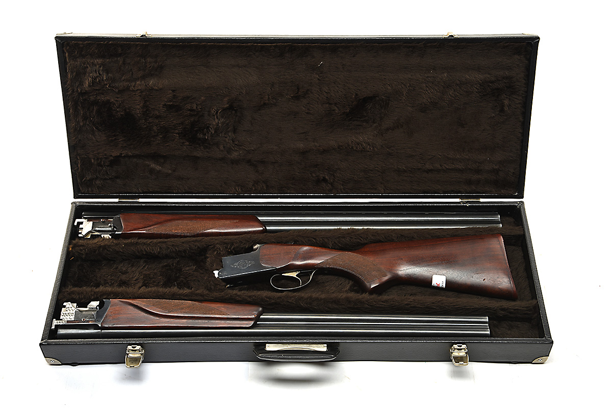 extra 26 1/2in. nitro barrels with 7mm ventilated matt top-rib, 2 3/4in. chambers, bored approx. true cyl. and open choke, with extra fore-end, hold-open toplever, selective single-trigger, partial scroll engraving, blacked finish, 13 3/4in. pistolgrip stock including buttplate, in a case with provision for both sets of barrels + extra barrels