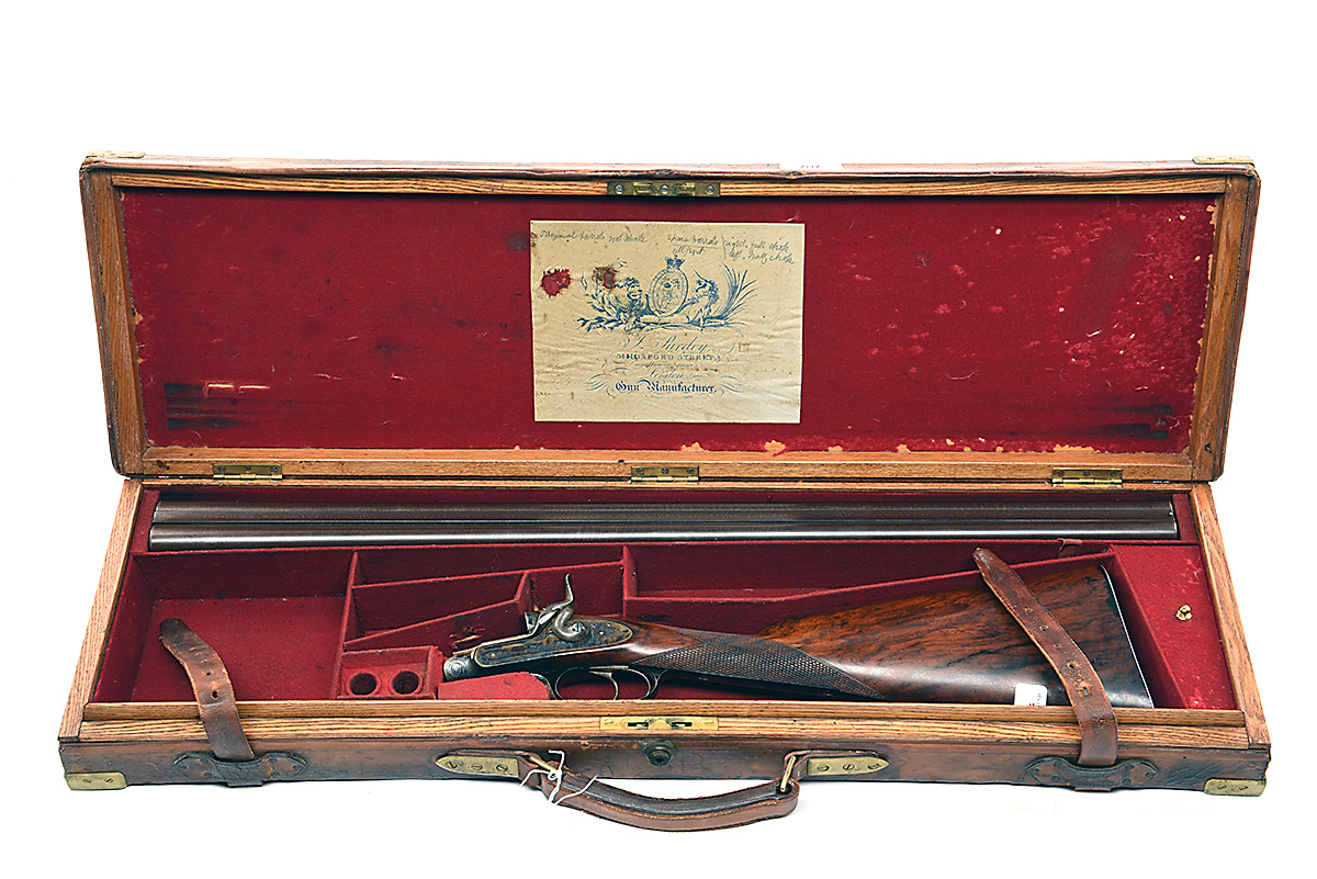 'J. PURDEY' 12-BORE ROTARY-UNDERLEVER HAMMERGUN, serial no. 5490, circa 1858, converted from muzzle-loader, 30in. black powder damascus barrels (pitted), rib spuriously engraved 'J. PURDEY & SONS. 314 1/2 OXFORD STREET. LONDON.', 2 1/2in. chambers, bored approx. true cyl. in both, Jones patent rotary underlever, carved percussion fences, non-rebounding locks (right hammer ear broken), border and partial scroll engraving, lockplates spuriously engraved 'J. PURDEY', retaining virtually full renewed colour-hardening and finish, 14 1/2in. figured replacement stock, weight 7lb., in a brass-cornered oak and leather case