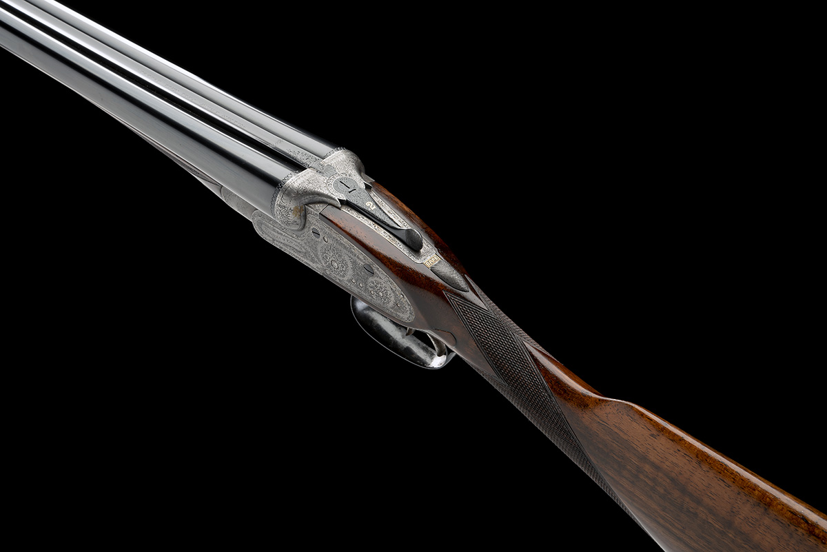 WILLIAM EVANS A 12-BORE SIDELOCK EJECTOR, serial no. 4123, for 1898, 28in. replacement nitro barrels (circa 1963), rib engraved WILLIAM EVANS. PALL MALL. LONDON.', 2 1/2in. chambers, bored approx. 1/4 and full choke, treble-grip action with removable striker discs, toplever gold-inlaid '2', automatic safety with brass 'SAFE' plaque, fine acanthus scroll engraving with floral bouquets and decorative scrolling borders, 15in. figured stock including 5/8in. ebonite extension, weight 6lb. 12oz.