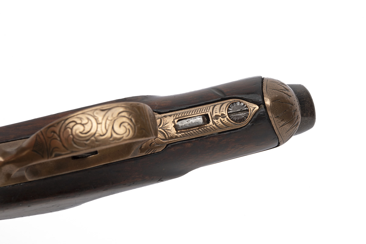made by North America Firearms Company, Philadelphia, circa 1868, with iron slide forwards barrel marked on the left side 'WILLIAMSON'S PAT OCT 2 1866 NEW YORK' (some shallow pitting), American scrolls engraved to backstrap and breech, flat sighting plane engraved with an arrow and fitted with a blade fore-sight, brass frame, walnut full-stock with chequered birdshead butt and guarded trigger with engraved bow and finial, complete with a later manufacture percussion converter