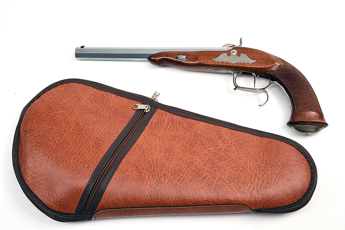 A REPRODUCTION .44 PERCUSSION PISTOL SIGNED PEDERSOLI, MODEL STAINLESS 'LE-PAGE', serial no. PD12494, with octagonal stainless-steel 10 1/2in. barrel, brushed bright lock, single set trigger and walnut half-stock with chequered grip and no provision for ramrod, in a vinyl pistol rug