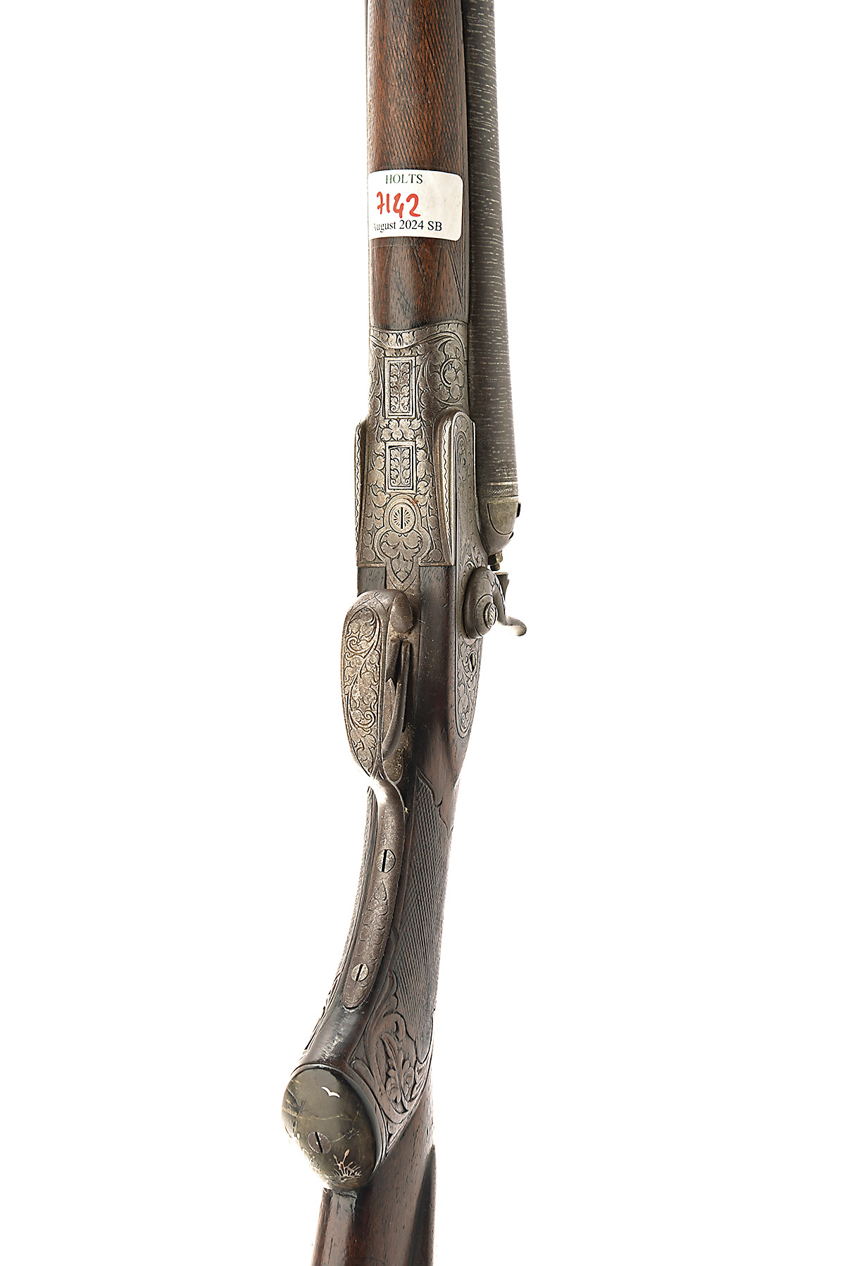 JOSEPH LANG & SONS 12-BORE TOPLEVER HAMMERGUN, serial no. 6240, for 1881, 30in. nitro reproved bold damascus barrels (loop detached), the rib engraved (loose) 'JOSEPH LANG & SONS. 22 COCKSPUR STREET. LONDON.', 2 1/2in. chambers, bored approx. imp. cyl. and 1/4 choke, carved percussion fences, slender toplever, rebounding back-action locks, border and fine acanthus scroll engraving, 14 1/8in. stock including buttplate, weight 6lb. 12oz.