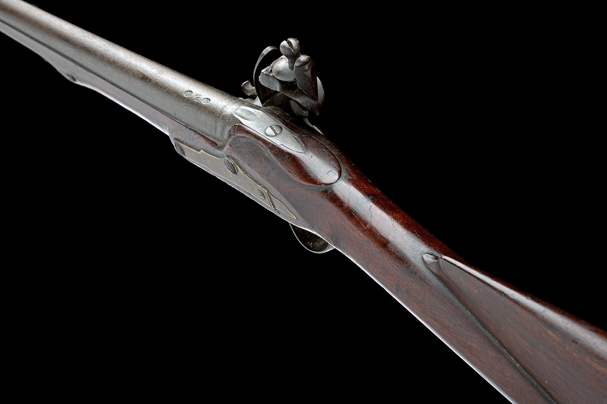 late 18th century, with round 42in. barrel (extensively shallow pitted externally), London proofs and maker's mark for Richard Wilson at breech, moulded band forwards of top-tang, stud fore-sight and shallow sighting groove to top-tang, flat bevel-edged lock with stepped and pointed tail, 'WILSON' signature below the shallow pan, swan-necked cock, walnut hand-rail full-stock, the fore-end finishing 4in. from the muzzle, carved apron around the top-tang, brass heel-plate with short broad triple-stepped spur engraved 'H.A.C.', moulded trigger guard bow and tang with well defined finial, 'sporting' style side-plate, four moulded ramrod pipes including throat, three iron barrel-keys, brass fore-end tip and iron ramrod (swivels absent)