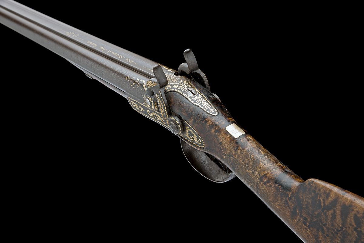 A CASED 16-BORE PERCUSSION DOUBLE-BARRELLED SPORTING GUN WITH GILDED DECORATION, serial no. 10883,