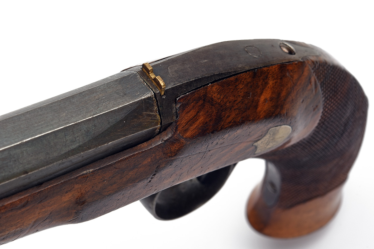 circa 1870 and possibly a Flobert's patent, with blued octagonal sighted false 'barrel', the actual 3 1/4in. micro-rifled barrel unscrewing from the muzzle for capping at rear, the action contained internally and cocked via a hooked lever stored beneath the barrel and operating against a roller bearing beneath the fore-end, walnut half-stock with chequered grip, square socket at rear for a detachable shoulder-stock (absent) and with white metal shield-shaped escutcheons to the rear of the moulded side-cheeks, guarded plain trigger, together with a later small wood box containing a later stripping tool, cleaning rods and other sundries