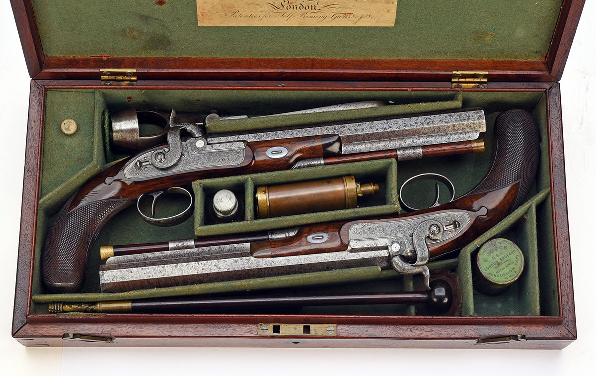 for between 1840-44, with octagonal 10in. scratch-rifled barrels signed in script 'JOHN MANTON & SON DOVER STREET LONDON', scroll engraved colour hardened breech-blocks with hexagonal based nipples, applied fore-sights, shallow standing notch rear-sights to the front of the engraved top-tangs, borderline and scroll engraved colour hardened locks with extensions above moulding to the sides of the standing breech and signed 'JOHN MANTON & SON PATENT', slab-sided hammers with dolphin engraved noses mirroring the nipple-wells and en-suite engraving, bolted safes, walnut half-stocks with chequered bag-shaped grips, blued and engraved iron furniture including domed butt-caps, single set triggers, white metal escutcheons to wrists engraved with a hippocampus below a crown, escutcheoned barrel keys, horn fore-end tips and mahogany ramrods, traces of finish remaining and in their maker's mahogany case lined and compartmented in green baize, good No.6 Dover Street trade label inside lid and complete with a three-way flask, matching number scissors ball mould, loading rod, turn-screw, cap-tin and a wad-punch, the same armorial as the pistols appearing on the lid escutcheon of case
