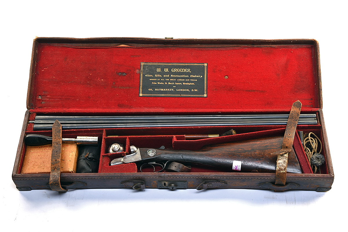 W.W. GREENER 12-BORE 'M1 MONARCH' FACILE-PRINCEPS EJECTOR, serial no. 50612, for 1902, 29 7/8in. sleeved nitro barrels (in 1970), the rib engraved 'W.W. GREENER. ST MARY'S SQUARE. BIRMINGHAM. WINNER AT THE LONDON GUN TRIALS. 1875 TO 1891. SIEMENS STEEL.', the breech-end engraved '1' and with a partridge, 2 1/2in. chambers, bored approx. 1/2 and full choke, treble-grip action, manual side safety with gold-inlaid 'SAFE' detail, border and acanthus scroll engraving, the makers name in a scrolling banner, Baker patent ejectors, patent no. 17292 of 29th October 1890, use number 272, 14 3/8in. figured stock, weight 6lb. 14oz., in its brass-cornered guncase with some cleaning accessories