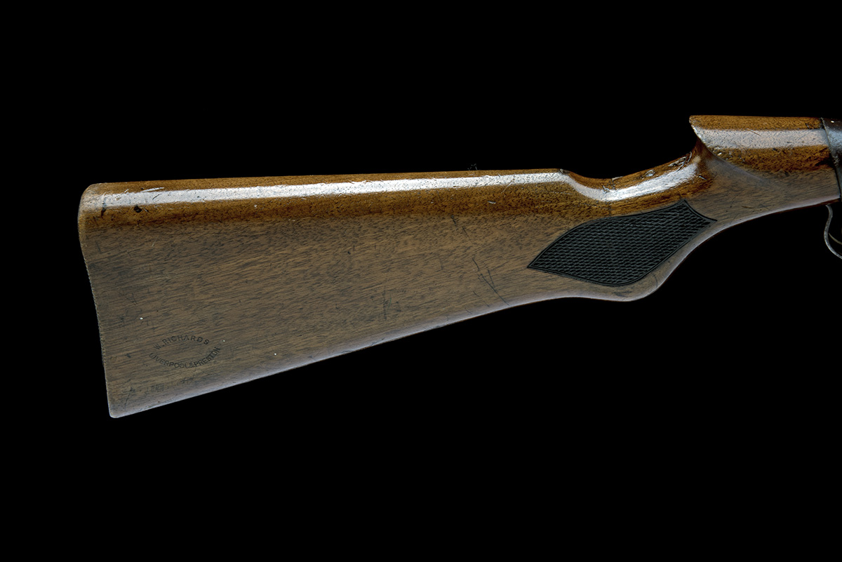 for 1924, with blued and sighted 17in. barrel, tap-action breech, plain air-chamber with faded but legible etched details, three-hole trigger block, chequered walnut saw-handled butt-stock, no provision for fore-end and push-button release under-lever, fair amount of original finish