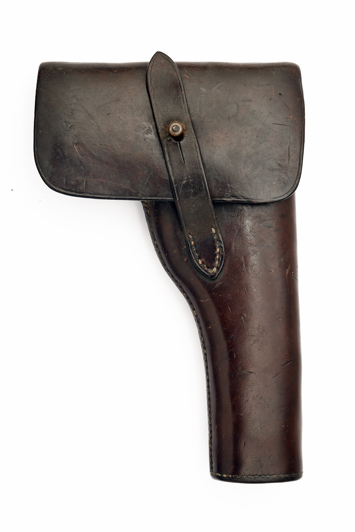 for 1914, with 6in. barrel, blued slide with make and model details, machined grips to rear of slide, hold-open device, spurred hammer, blued full-length frame, undersize chequered hard rubber grips, lanyard swivel at heel and correct magazine, much original blued finish remaining, complete with a period leather full-flap holster and a certificate of proof dated 2025