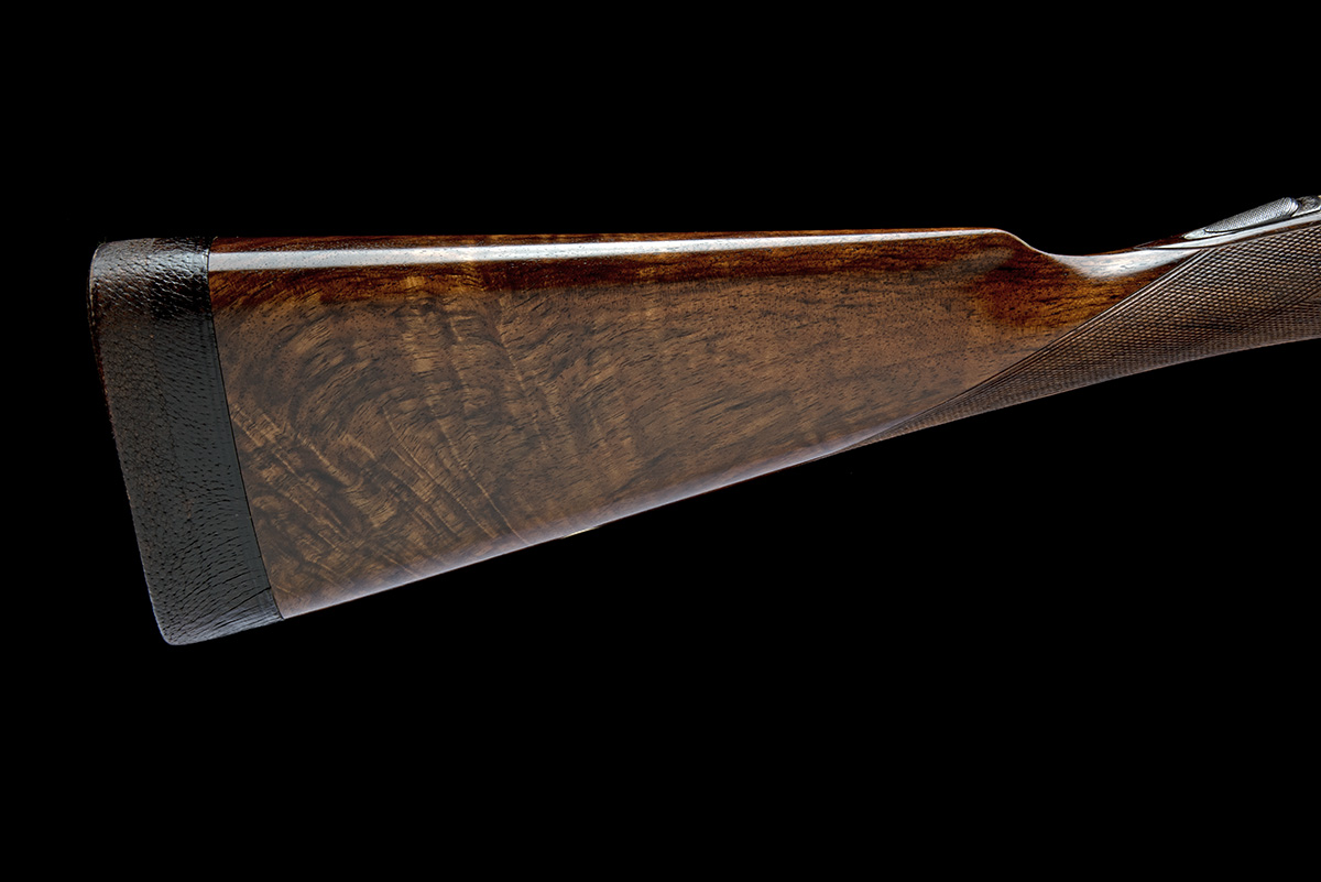 for 1932, 28in. nitro reproved barrels (in 1989), the rib engraved 'ROWLAND WATSON 17. WHITTALL STREET. BIRMINGHAM.', 2 1/2in. chambers, bored approx. imp. cyl. and 1/4 choke, scroll-back treble-grip action, automatic safety with gold-inlaid 'SAFE' detail, fine border and acanthus scroll engraving with central floral designs, retaining much colour-hardening and finish, 15in. stock including 1 3/8in. leather covered recoil pad, weight 6lb. 10oz.