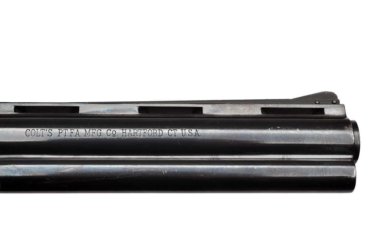 for 1961, with blued 6in. barrel, the right side marked 'COLTS PT. FA. MFG. CO. HARTFORD CT. USA' in tall shallow letters, the left with model and calibre on two lines, ramp fore-sight, adjustable rear-sight, blued solid frame with swing-out fluted cylinder, double action mechanism with polished sides to the spurred hammer, oil-finished walnut grips with raised chequered panels to both and inlet with Colt trademarked medallions, light holster wear at muzzle but much original finish remaining