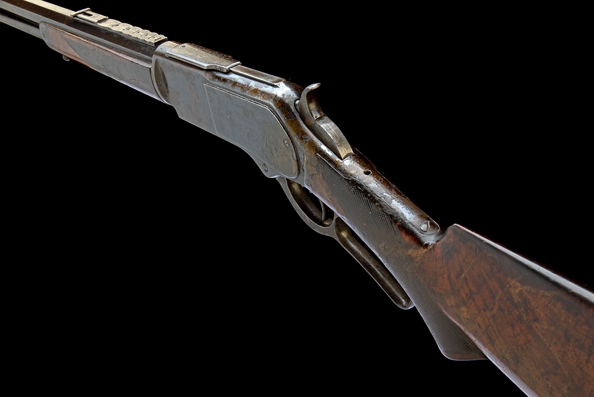 for 1884, with octagonal 28in. barrel, the top-flat marked 'WINCHESTER'S REPEATING ARMS NEW HAVEN CONN USA' over 'KING'S IMPROVEMENT PATENTED MARCH 29 1866 OCTOBER 16 1860', folding ring fore-sight with bead and blade, 'Africa' rear-sight of folding ladder with six further graduated flush folding blades, each with platinum centre-line, calibre designation and addition South African registration number (WR18606) to left side of breech, blued receiver with period London proofs, automatically retracted sliding dust-cover operating on an integral rail, colour hardened central hammer, model designation to top-tang (blanking plug for an auxiliary peep-sight absent), chequered walnut pistol-grip butt-stock of approximately 3X grade, smooth iron shotgun heel-plate, horn inlay to grip, single set trigger (set currently not functioning), chequered walnut fore-end of similar grade to butt, full-length magazine tube and eyelets for the Winchester Sling (sling absent), strong traces of finish and colour