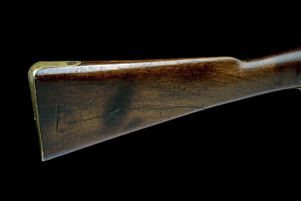 being a later South African registration number, commercial production dated for 1872, with five-groove 19 3/8in. barrel, block and blade fore-sight, carbine length ladder rear-sight, Birmingham proofs, flip-open breech with sprung thumb-catch and marked 'SNIDER'S PATENT' together with 'VB' marks, plain lock, the bar signed 'V.R. BLAKEMORE' over 'BIRMINGHAM & LONDON', all behind 'TOWER', the tail with dated crown stamp, walnut half-stock with brass furniture, the heel-plate with central trap, iron saddle-bar to left side and retaining a chained pin-guard and its original leather rear-sight protector