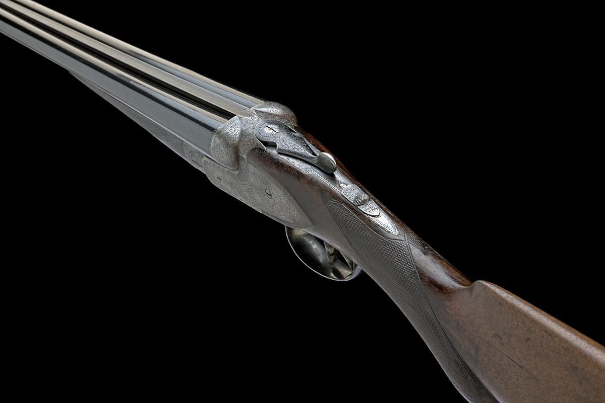 for 1940, 26in. nitro barrels, finely wave cut rib with replacement small bead fore-sight (original button foresight with the Lot), the tubes engraved 'AUGUSTE FRANCOTTE BREVETE A LIEGE', 2 3/4in. chambers, bored approx. true cyl. and 1/4 choke, treble-grip action with side-clips, automatic safety, action and decorative sideplates with fine acanthus scroll and floral engraving, the triggerplate signed 'GRAVEUR L. SMEETS', likely replacement floorplate screw, retaining traces of colour-hardening and finish, 14 1/2in. semi-pistolgrip stock including horn buttplate, weight 5lb. 11oz.