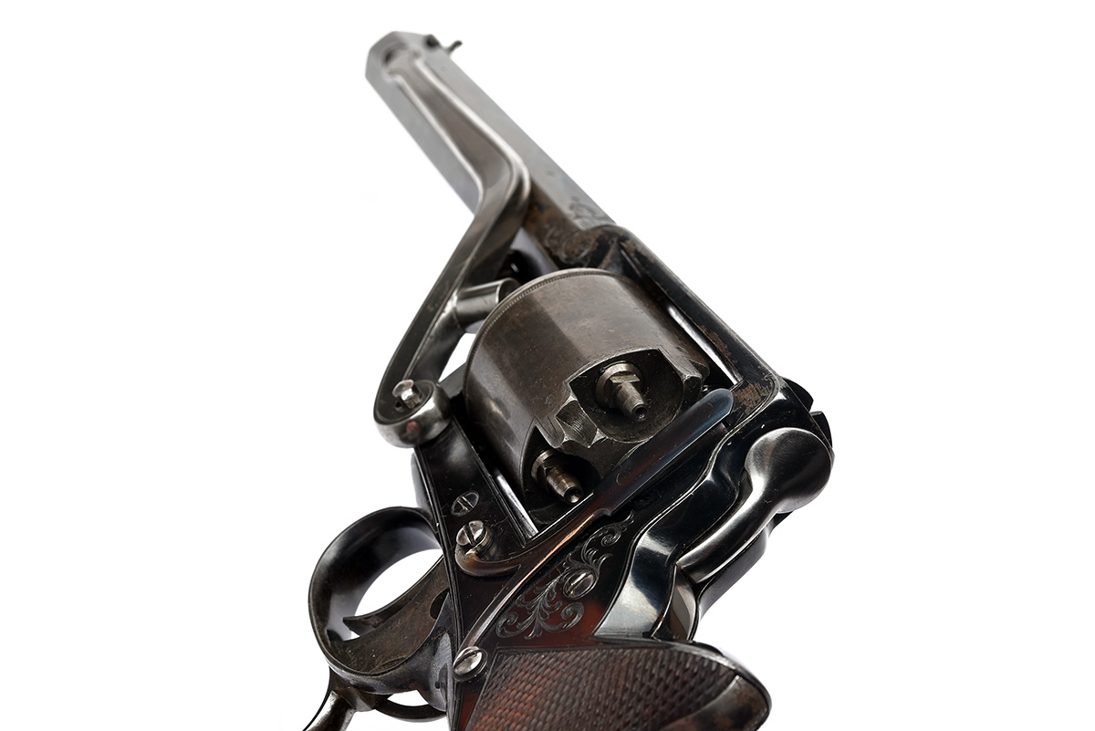 second model circa 1856, with blued 6 1/4in. octagonal barrel, engraved band at muzzle and scroll engraving at barrel-throat, dove-tailed beaded blade fore-sight, standing notch rear-sight to the rear of the border-engraved top-strap, the top-strap signed 'ROBERT JONES, No.3 GREAT HOWARD ST, LIVERPOOL' (possibly added later), borderline and scroll engraved blued frame, inverted 'Y' shaped safe-spring, colour-hardened borderline engraved five-shot cylinder (colour faded), Tranter's patent trigger cocking mechanism with spurless hammer, swept chequered walnut semi saw-handled grip with engraved and moulded iron cap, signed detachable rammer mounted to left side of barrel, strong amount of original finish throughout and together with its maker's walnut case with mahogany lid, lined and compartmented in green baize, complete with its matching number Tranter's Patent mould, a good condition Dixon bag-shaped flask, mahogany loading rod, Tranter's lubricating compound and bullets, oil bottle, turn-screw, nipple-key and Eley's Superior caps, all appearing little used, the inside of lid with Jones red parchment trade label
