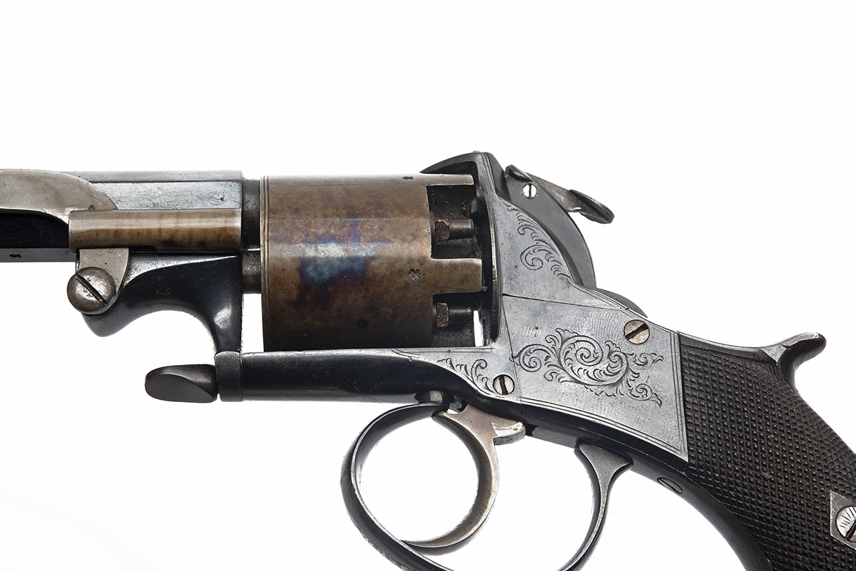 circa 1852, with well reblued 5in. octagonal barrel, small bead fore-sight, standing rear-sight notch to the recoil shield, borderline and scroll engraved open iron frame, spurless hammer with Bentley's patent hammer safe, well recoloured plain cylinder, finely chequered walnut grips with saw-handle spur to back-strap and Kerr patent rammer to left side of barrel, in a period mahogany case lined and compartmented in blue baize and including a small flask, a 54-bore mould, a nipple-key, turn-screw, oil-bottle, ebony loading rod and cap-tin