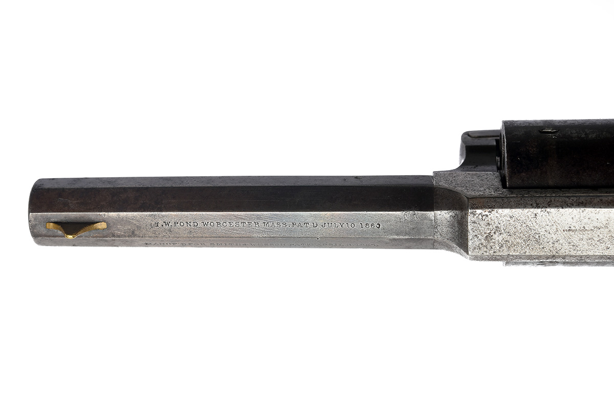 circa 1862, being one of 4486 awarded to Smith & Wesson after successfully suing Pond over infringement of the Rollin White patent, the octagonal 4in. barrel signed on the top-flat 'L.W. POND, WORCESTER MASS. PAT'D JULY 10 1860', the left hand side additionally marked 'MANUF'D FOR SMITH & WESSON PAT'D APRIL 3 1855', tip-up two piece iron frame hinged at rear of top-strap, push button release to left hand lower frame, plain cylinder, colour hardened hammer and smooth flared walnut grips