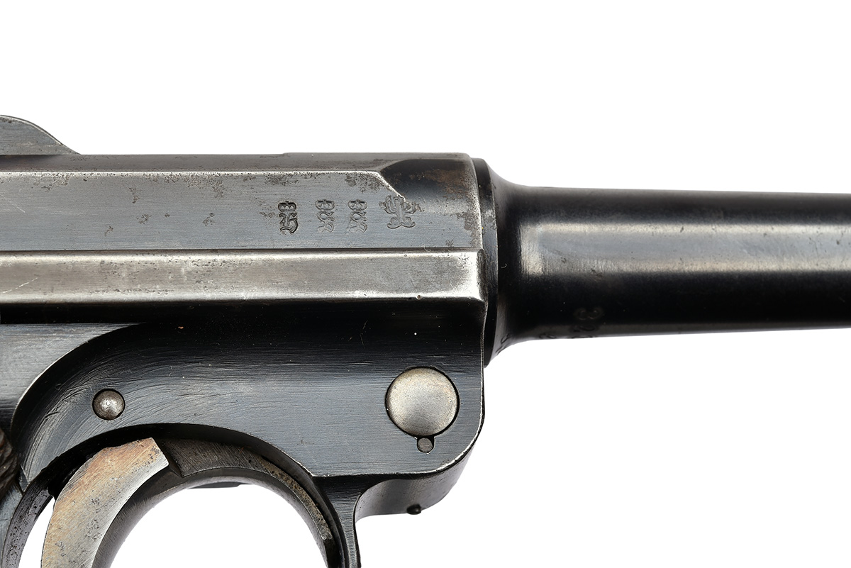 the pistol dated for 1915, with blued 4in. barrel, blade fore-sight, dated nocksform, 'DWM' manufacturer's mark to the top of toggle, blued receiver and frame, chequered walnut grips, provision for stockboard and wood based magazine, all matching numbers except magazine and with a certificate of proof
