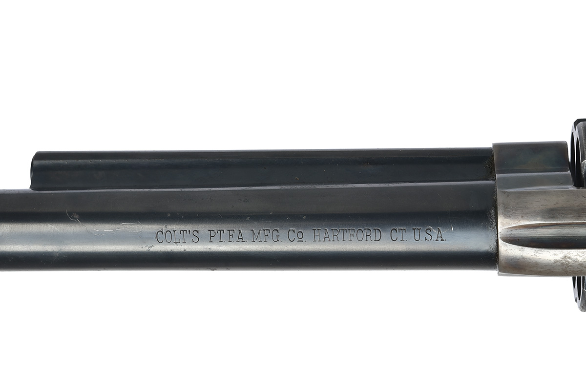 for 1963/64, with blued round 7 1/2in. barrel, top of barrel signed 'COLT'S PT FA. MFG. CO. HARTFORD CT. USA', left side marked 'COLT SINGLE ACTION ARMY .45', blade fore-sight, sighting groove to the top-strap, solid colour hardened frame (serial number re-applied), blued screws, polished sides to the hammer, blued grip-straps and replacement smooth walnut grips, much finish remaining