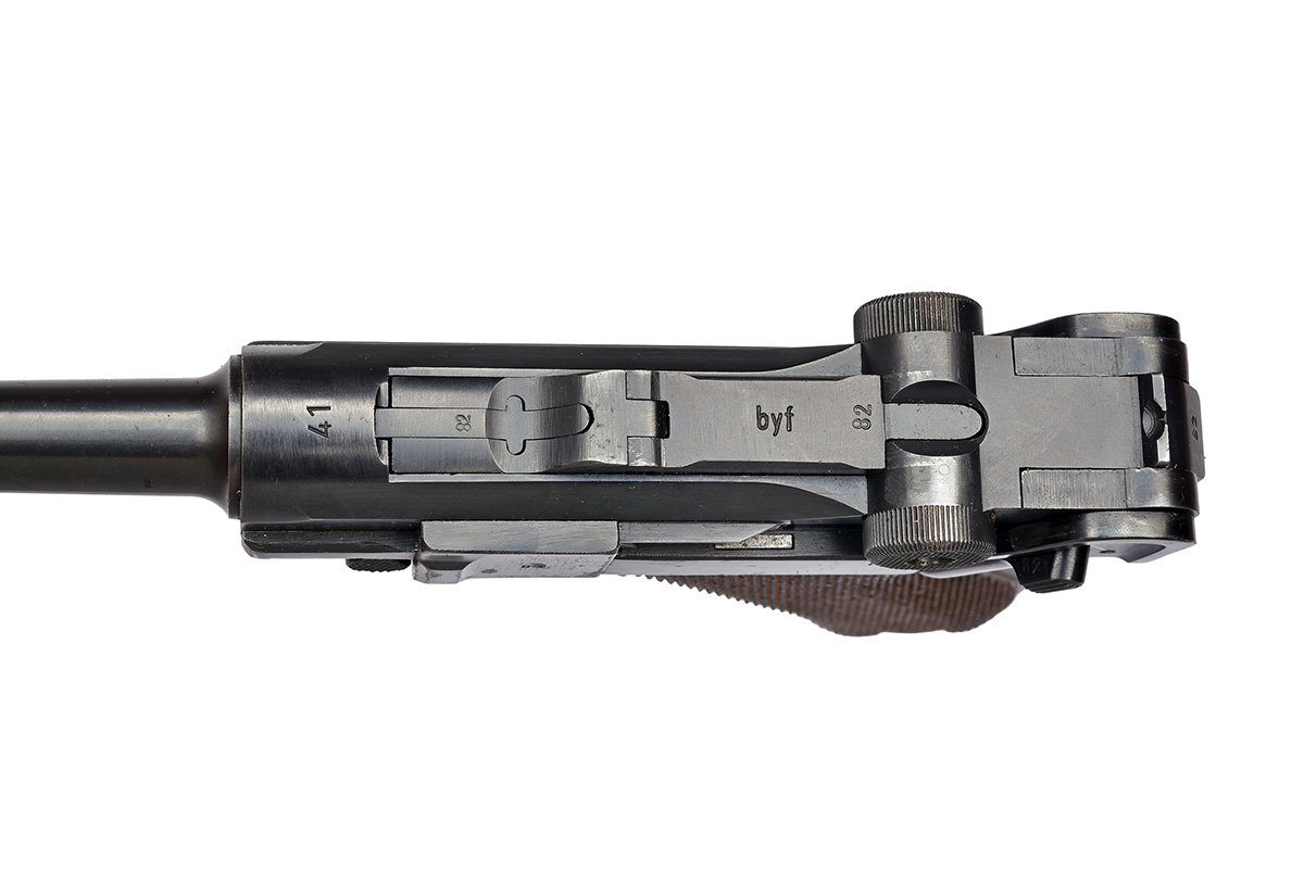 the pistol dated for 1941, with blued 4in. barrel, blade fore-sight, dated nocksform, 'BYF' manufacturer's code to the top of toggle, blued receiver and frame, chequered walnut grips, provision for stockboard and bakelite based magazine, all matching numbers except magazine and in a blackened brown leather service holster dated '1939' and signed 'VOEGELS KOLN', the reverse also marked with a waffenampt stamp, with a similar spare period magazine, stripping tool and certificate of proof