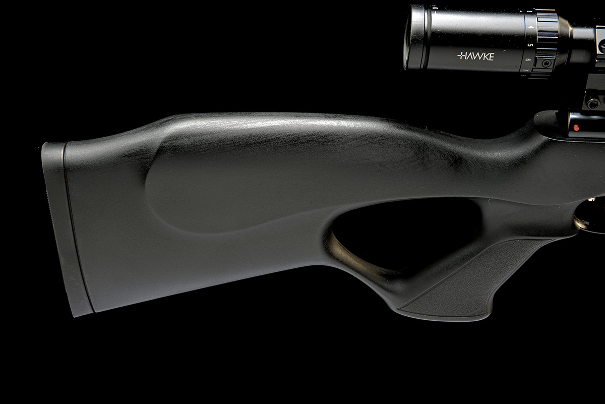 recent, with blued 14 1/2in. barrel including built-on sound moderator, sliding breech, blued air-chamber with push-button automatic safe, black synthetic ambidextrous three-quarter stock and full-length under-lever, appearing little used and fitted with a Hawke 3-12x50 telescopic sight, the whole in an abs plastic foam-lined carry-case with instruction leaflet and a quantity of pellets