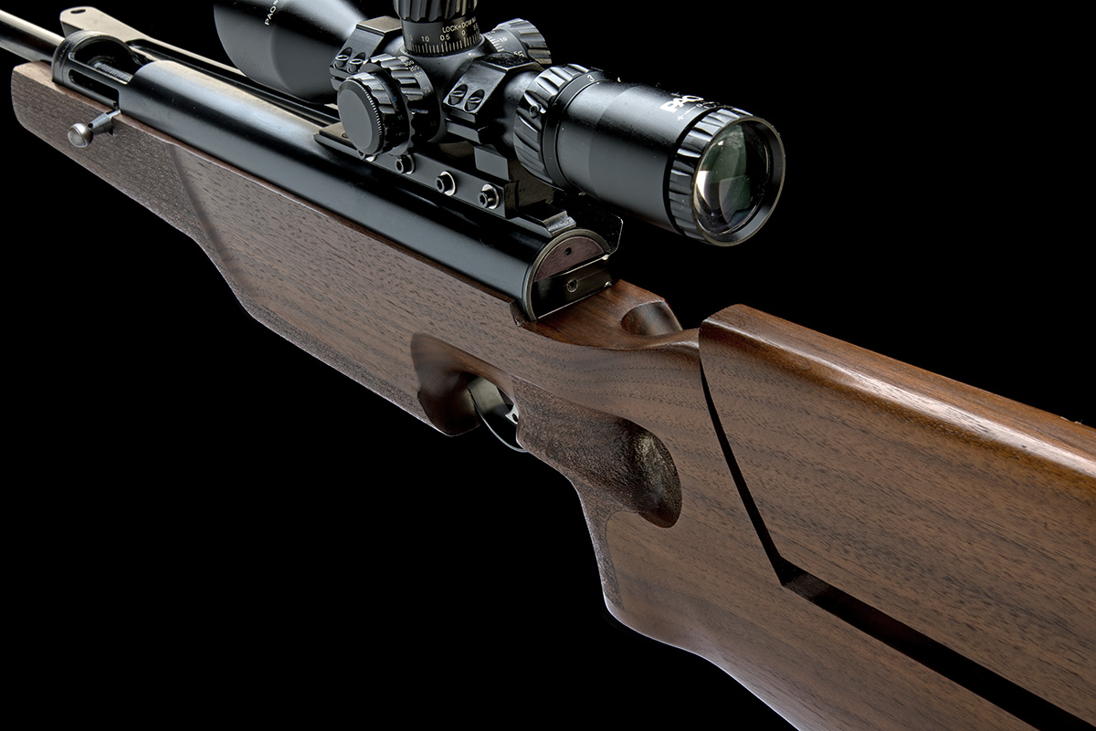 circa 1988, with shrouded blued 19 1/2in. barrel sliding forwards to load, threaded at muzzle for a sound moderator and with chequered protector, locking bolt handle to left hand side, the top of breech marked 'GENESIS, A.R. SPENCER AIR LOGIC ENGLAND PATT APPLIED FOR', blued air-chamber with applied machined telescopic sight rail, machined blackened alloy side-lever pump-handle mounted to the right hand side, period anatomical right-hand stippled walnut thumbhole half-stock with adjustable comb and rubber recoil-pad (probably by 'CS'), the whole retaining nearly all its original finish and in working order, together with a PAO 3-12x44 telescopic sight.