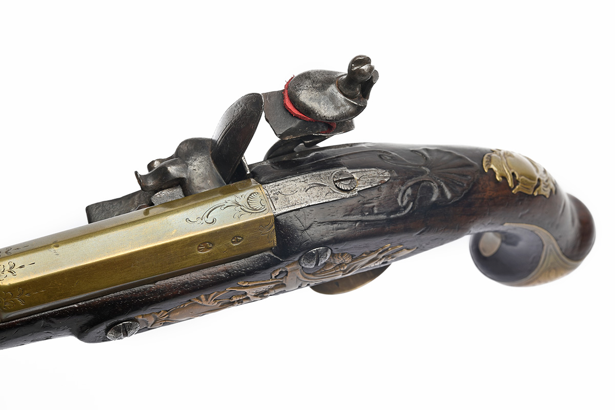 circa 1775, with brass octagonal to round slightly swamped 8in. barrel, moulded band at the intersection and floral engraving to the tip of the top flats, London proofs, solid iron top-tang, flat borderline engraved lock with florally engraved pointed tail and signed 'KETLAND' & CO.' below the shallow pan, working replacement swan-necked cock, walnut full-stock with rococo carved apron around the top-tang, brass furniture including rococo moulded escutcheon, pierced sideplate and long spurred bulbous butt-cap, guarded trigger with acorn finial and horn tipped ramrod