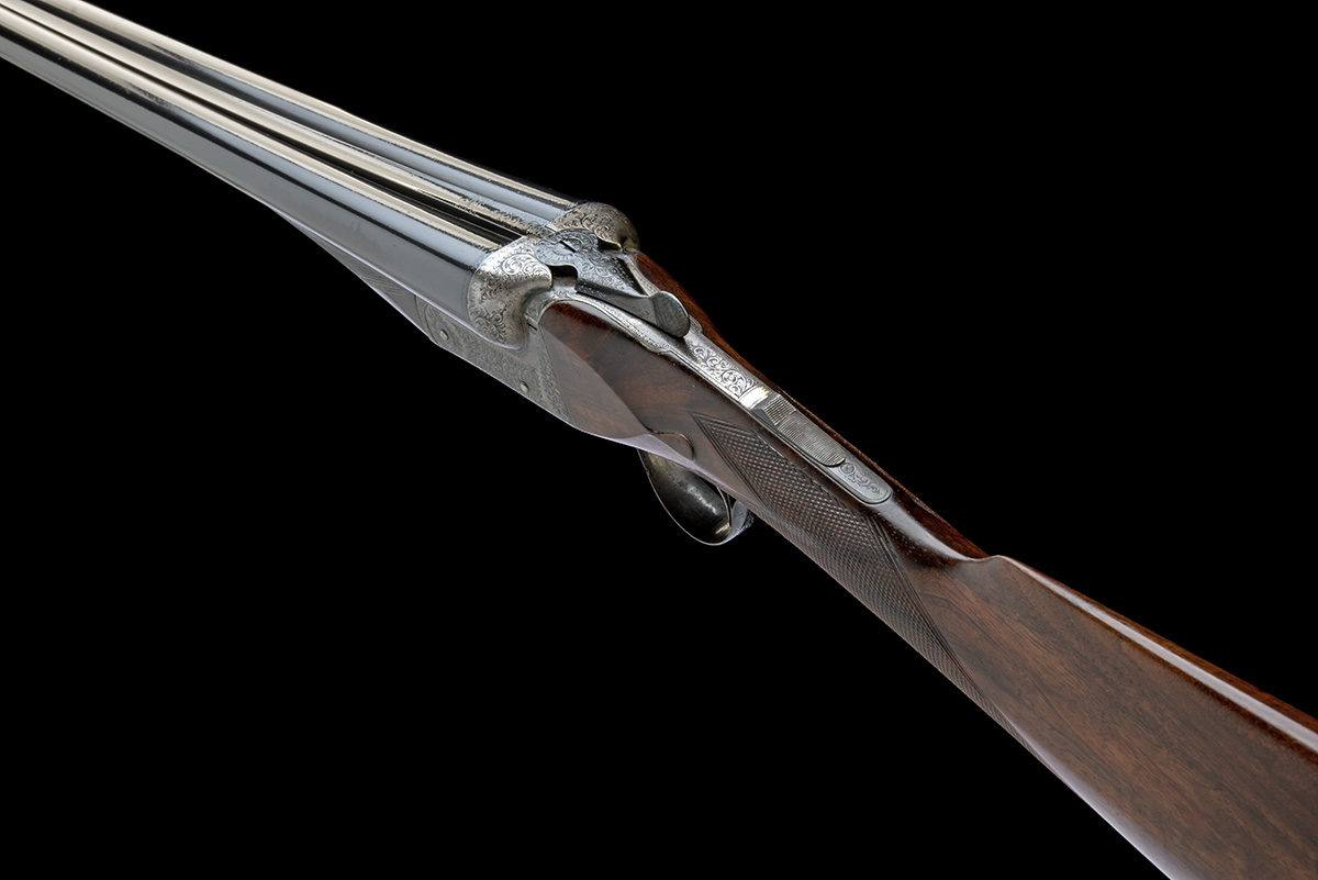 for 1908, serial number on barrel loop only and Holloway number H6691 on under rib, 28in. nitro barrels, the rib engraved 'W. HORTON. BUCHANAN ST. GLASGOW' and with acanthus scroll detailing at the breech end, 2 1/2in. chambers, bored approx. imp. cyl. and 1/2 choke, treble-grip action with intercepting sears, automatic safety with gold-inlaid 'SAFE' detail, patent single trigger with ovate triggerguard, retaining traces of colour-hardening and renewed finish, 14 1/8in. figured stock, weight 6lb. 7oz.