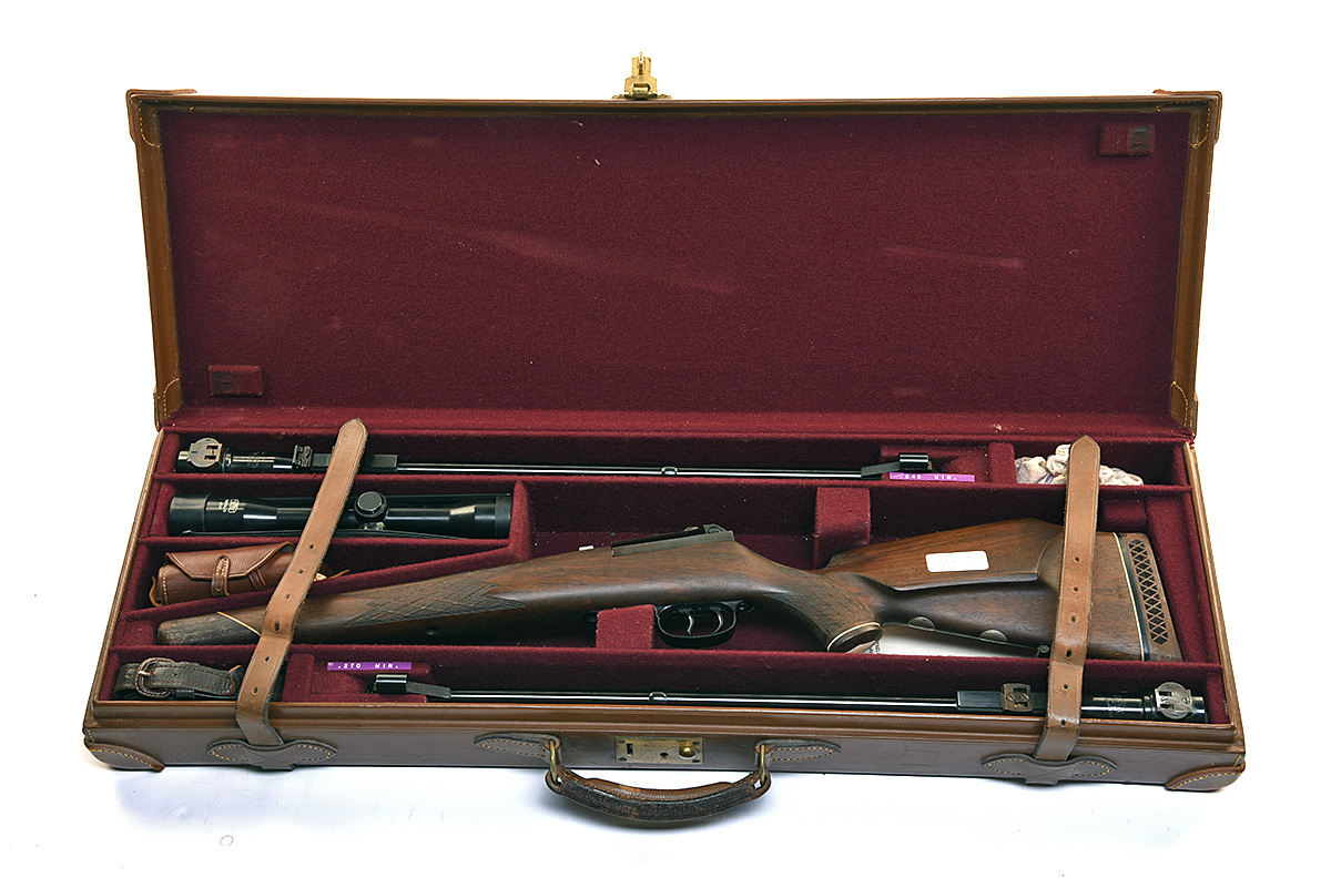 ORIGINAL MAUSER-WERKE .243 WIN 'MOD 66' BOLT-MAGAZINE TAKE-DOWN SPORTING RIFLE, serial no. 09291, with extra barrel, .243 24 1/2in. barrel dated 1969, hooded ramp-mounted bead fore-sight, 2 x folding rear-sights, .270 Win 24 1/2in. barrel dated 1968, hooded ramp-mounted bead fore-sight, 2 x folding rear-sights, a carl Zeiss Diatal-D 4x32 telescopic sight, serial no. 998190, with quickly detachable claw mounts, manual safety, set triggers, well-figured pistolgrip stock with ventilated recoil pad and cheekpiece, sling swivels, set in a leather maroon baize-lined guncase, brass lock (including key), the lid exterior marked 'R.J.M.'