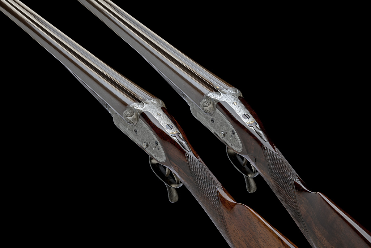 for 1891, 30in. nitro reproved damascus barrels (in 1969), the ribs engraved '"THE AUTOMATIC"' in gothic script and 'JAMES WOODWARD & SONS. 64. ST JAMES'S STREET. LONDON.' (refreshed) and gold-inlaid '1' and '2', 2 1/2in. chambers, bored approx. imp. cyl. and 1/4 choke (No.1) true cyl. and 1/4 choke (No.2), sideclipped Woodward 1881 patent snap-actions with arcaded fences, removable striker discs, the top straps gold-inlaid '1' and '2', automatic safeties with gold-inlaid 'SAFE' details, protruding tumbler pivots with gold-inlaid cocking-indicators, best fine acanthus scroll engraving, the faces of the actions engraved 'Woodward's Patent', 'THE AUTOMATIC 616' and '617' respectively, 14 1/2in. figured stocks including buttplates, weight 6lb. 8oz. (No.1) 6lb. 14oz. (No.2), in their brass-cornered oak and leather double guncase with some accessories including numbered spare striker pots, the tooled leather lid exterior marked 'J.F. RILEY.'