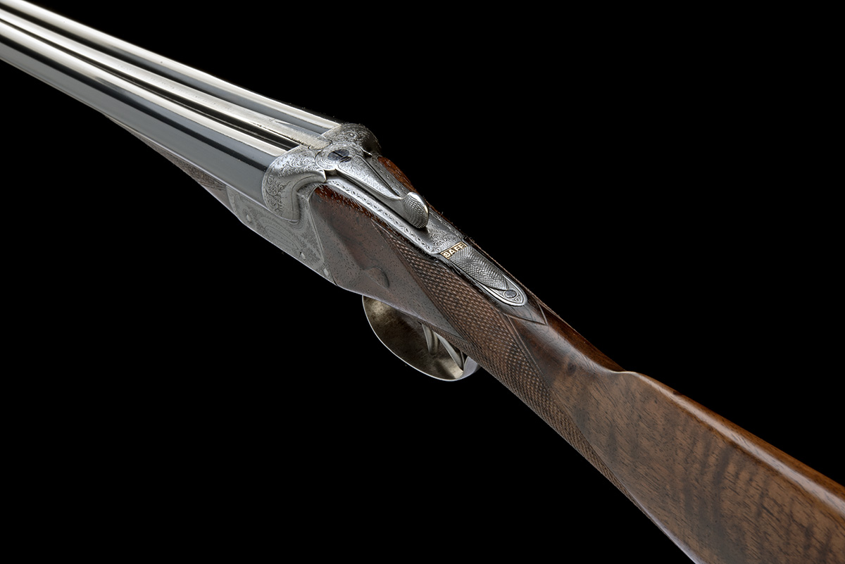 for 1901, 28in. nitro reproved barrels (in 1966), rib engraved 'WILLIAM EVANS. FROM PURDEY'S. 63. PALL MALL. ST. JAMES'S. LONDON.' and with acanthus scroll detailing at the breech end, 2 1/2in. chambers, bored approx. 1/4 and 1/2 choke, treble-grip action, removable striker discs, automatic safety with gold-inlaid 'SAFE' detail, border and acanthus scroll engraving, the makers name in a scrolling banner, brushed finish, 14 1/2in. stock including 2in. wooden extension (cast on for the left shoulder), weight 5lb. 2oz.