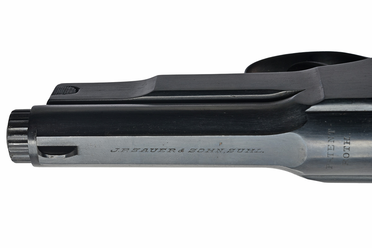 circa 1906, with unique 'long-recoil' 4in. sliding barrel and bolt, blued barrel shroud and receiver, the top-flat signed 'J.P. SAUER & SOHN, SUHL', the receiver bridge marked 'PATENT ROTH' and the 'Sauer' trademark behind charger bridge (rubbed), removable side-plate to frame, internal magazine, chequered hard-rubber grips with 'Sauer' trademark (left cracked and well repaired), the whole retaining virtually all of an older refinish