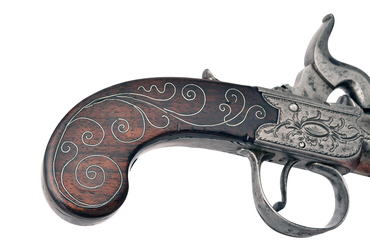 circa 1840, with multi-stage turn-off round 2 1/2in. barrel (cleaned), private proof stamps, borderline and scroll engraved squared boxlock action with radiused edges, left side signed 'WARD & STEELE', central hammer (cleaned), with top tang push-forward safety locking the hammer, slab-sided walnut grip with white-metal wire inlay