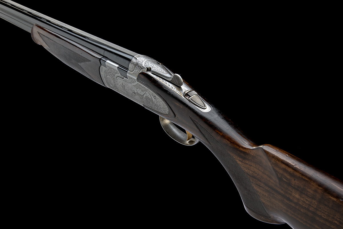 for 2001, 29 1/2in. nitro barrels with 6mm ventilated matt top-rib, 3in. chambers, bored approx. imp. cyl and 1/4 choke, hold-open toplever, automatic safety with integral barrel selector switch, gold-washed trigger, floral and acanthus scroll engraving with game scenes of pheasant and woodcock, 14 1/2in. pistolgrip stock including wooden buttplate, weight 6lb. 5oz., in its universal case with paperwork