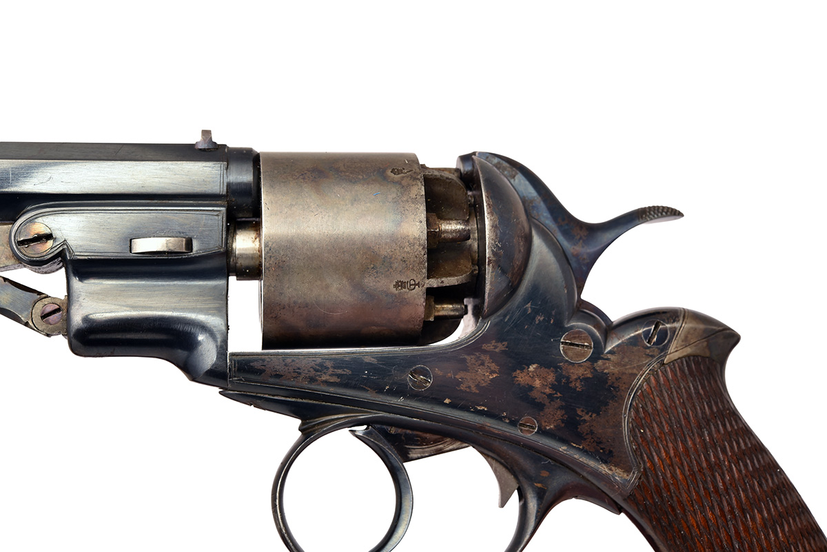 first model circa 1858, with 4 3/4in. octagonal sighted barrel, the top flat inscribed 'GEORGE H. DAW, 57 THREADNEEDLE ST. LONDON, PATENT NO. 515', fitted with a colour hardened under-lever rammer of compound linkage design, blued open borderline engraved frame marked 'PATENT NO 515', five shot London proved colour hardened cylinder (finish faded) also marked 'PATENT NO. 515', double action mechanism, the contrasting blued hammer lacking the customary flash shield of later models, chequered walnut grip with colour hardened back-strap and domed butt-cap, lanyard ring at heel, the revolver retaining the majority of its original finish and colour and complete in its original green baize lined and partitioned oak case, George Daw trade label inside lid, together with period mould, flask, loading rod, cap tins and oil bottle