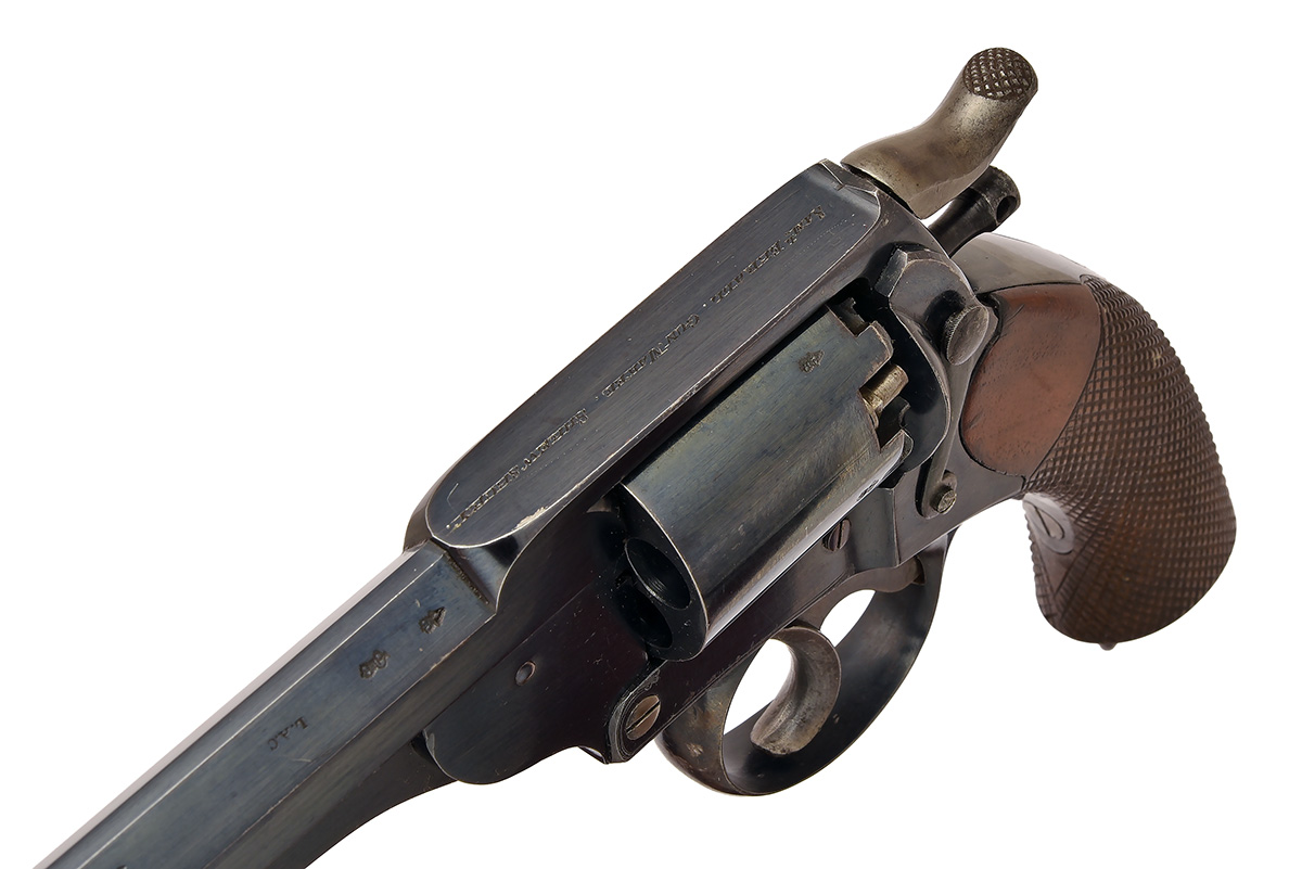 circa 1855, with blued 5 3/4in. octagonal barrel marked 'L.A.C.' and with London proofs, pillar fore-sight, shallow notch rear-sight, the top-strap signed 'SAM'L EBRALL, GUNMAKER, SHREWSBURY', blued frame with plain five-shot cylinder, colour-hardened curved lockplate signed 'LONDON ARMOURY', colour-hardened side-hammer, chequered one-piece walnut grip with blued butt-cap and lanyard ring to base, blued trigger-guard bow with colour hardened trigger, blued hinged loading lever under the barrel, the whole in a fine state of preservation with loss of blue only to sharp edges and generally appearing little used, together with a period oak case (probably original to the gun), compartmented and lined in green baize and containing a number of accessories including a Hawksley bag shaped powder flask, nipple key-turn-screw & oiler combination tool, mahogany cleaning rod and a brass double cavity Adams Patent bullet mould, along with lubricated bullets, caps and a nickel oil bottle, a facsimile instruction label inside lid