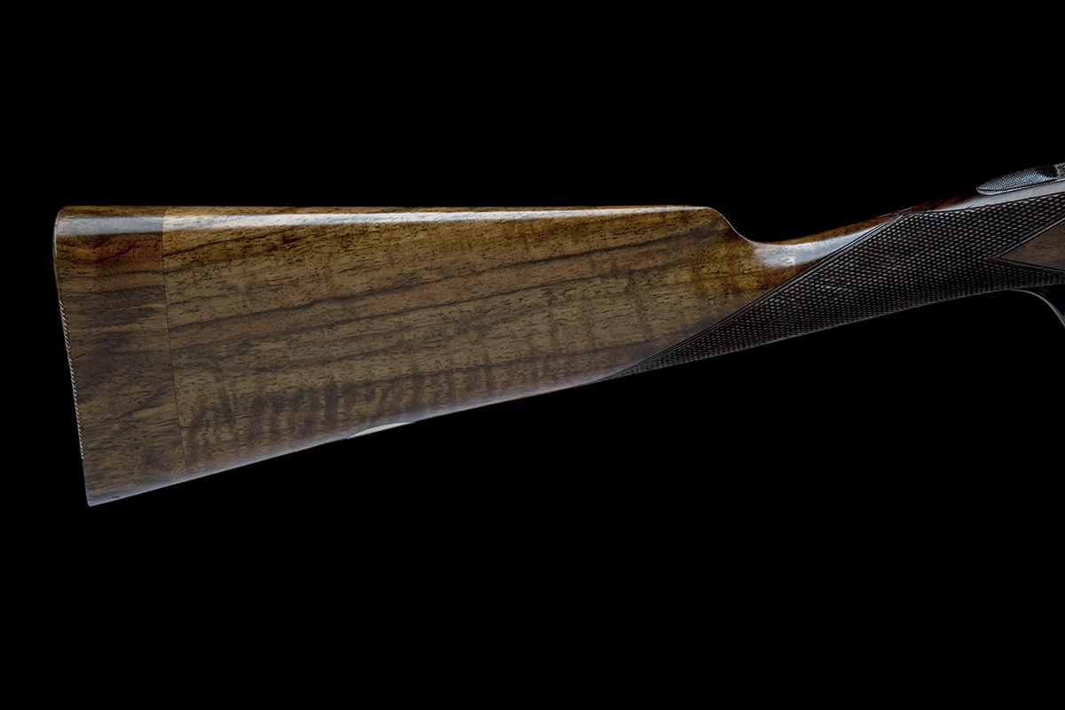 for 1927, 25in. nitro reproved barrels (in 1992), matted rib with small banner engraved 'XXV', the tubes engraved 'E. J. CHURCHILL (GUNMAKERS) LTD. 39 TO 42 LEICESTER SQUARE. LONDON.', 2 3/4in. chambers, bored approx. true cyl. in both, treble-grip action with removable striker discs, automatic safety with 'SAFE' detail, border and acanthus scroll engraving, the makers name in scrolling banners to the sides, the underside inlaid with a four pearl crown over 'XXV', retaining slight traces of original colour-hardening, 13 1/2in. stock including 1 1/4in. wooden extension, weight 4lb. 15oz., in its lightweight leather 'V.C.' case