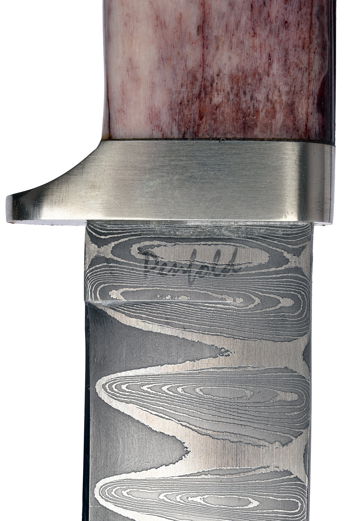 circa 2010, the first with 3 1/2in. drop point ladder damascus hand-forged blade etched for contrast, secret 'PENFOLD' signature to right side of forte, nickel-silver bolster with integral short finger-guard, pale burgundy-stained giraffe bone pinless scales and lined lanyard aperture to heel, in a leather scabbard, the second of one-piece raindrop damascus, 3 3/4in. blade with false edge for the last 2 1/2in., guardless unscaled design with finely scalloped back edge and twin finger cut-outs to underside, secret 'PENFOLD' signature to left side, in a leather pocket-slide scabbard